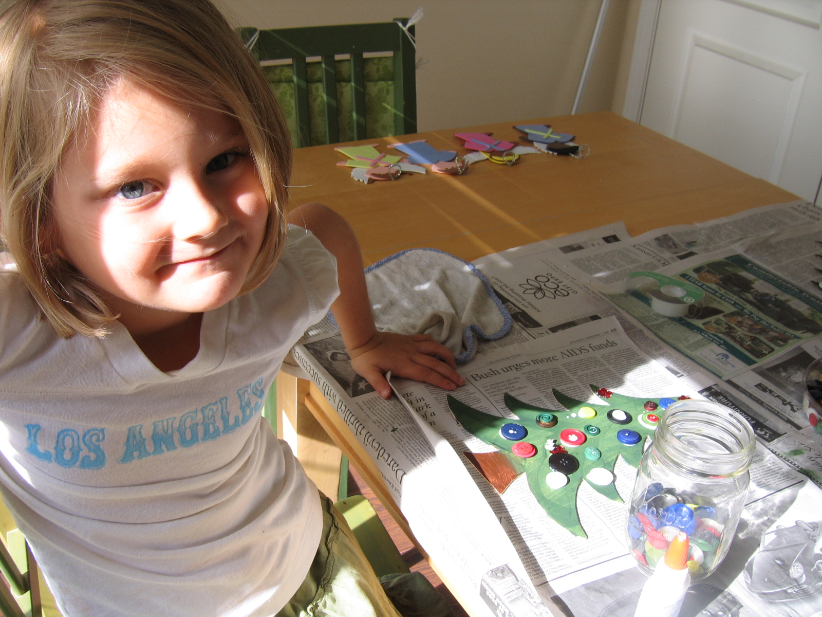 All that was needed was a pre-cut tree from Michael's (50 cents), some green paint, brown paint, lots of buttons and, of course, the Elmer's glue.